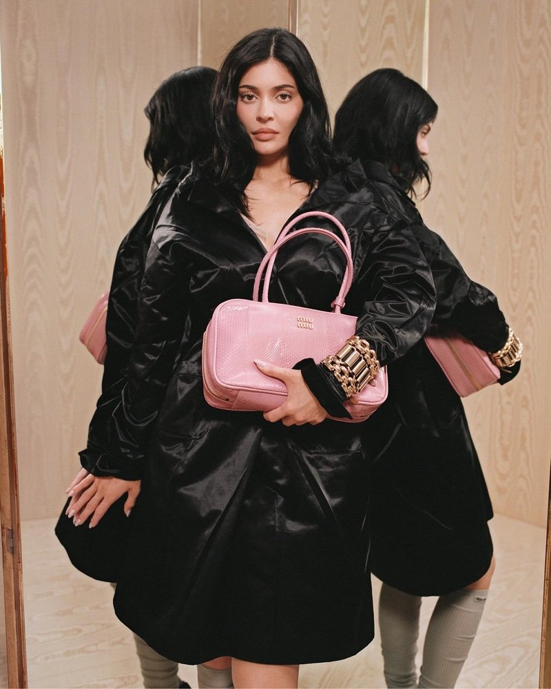 The campaign opens with Jenner poised against mirrored walls, a soft pink Miu Miu bag clasped like a shield. The image is striking: part armor, part accessory. Dressed in a gleaming black satin coat with heavy gold chain cuffs circling her wrists, she radiates confidence, edge, and intention. It’s a statement not just about fashion, but about power—the kind defined on personal terms.